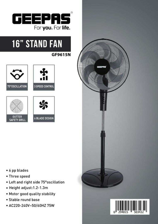 پنکه جیپاس مدل GF9615 یک پنکه ایستاده با قابلیت تغییر ارتفاع و همچنین دارای تایمر است. تعداد پره های پلاستیکی شفاف آن 5 عدد است و سیم پیچ الکتروموتور از سیم مسی با کیفیت و ضخامت مناسب می باشد.برند جیپاس GEEPAS یکی از عرضه کنندگان لوازم خانگی و برقی است که با بیش از 36 سال تجربه ، در اغلب قاره ها اعم از آسیا و اروپا و آمریکا از استقبال خوبی برخوردار است.پنکه ایستاده جیپاس مدل GF9615 از انواع پنکه های ایستاده است که کیفیت بسیار مناسبی دارد . در داخل جعبه دستگاه پایه و میله وسط و پره های و بدنه اصلی و پره قرار دارد که به آسانی می توانید آن را مونتاژ کنید .میله وسط از جنس استیل بوده و از استحکام بالایی برخوردار است و باعث می شود ارتفاع پنکه را بتوان با یک پیچ در پشت آن به 130 سانتیمتر رساند