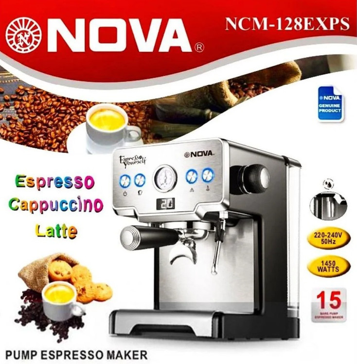 اسپرسوساز نوا مدل NCM-128EXPS دستگاهی با قابلیت تولید 15 بار فشار بخار است توان این دستگاه 1450 وات است و مخزن آب 1.7 لیتری آن در عرض چند دقیقه به جوش میآید. این اسپرسوساز با کیفیت قابلیت تنظیم میزان بخار و همچنین قابلیت تنظیم میزان قهوه را دارد از این رو امکان آماده سازی انواع نوشیدنیهای قهوه دار با استفاده از این اسپرسوساز وجود دارد.