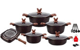 سرویس17 پارچه شامل: قابلمه 20 سانتیمتری (2.4 لیتر)، 24 سانتیمتری (4.4 لیتری)، 28 سانتیمتری (6.6 لیتری)، 32 سانتیمتری (9.6 لیتری), تابه عمیق 28 سانتیمتری (4 لیتری) و ۷عدد وسایل اشپزی