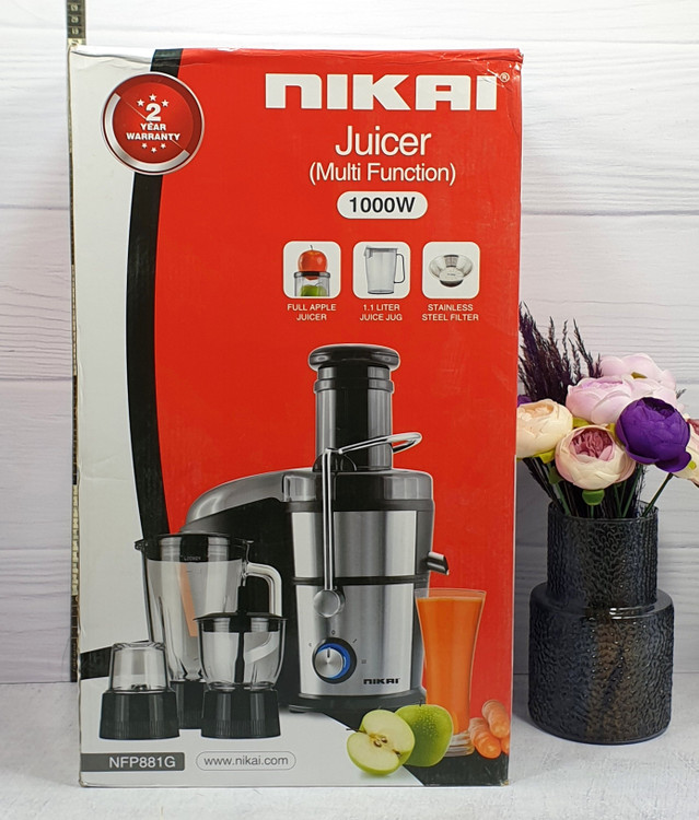 I آبمیوه گیری 4 کاره نیکایی یک غذاساز با موتور1000 واتی توربو است که چهار کار می تواند انجام دهد : آبمیوه گیری - مخلوط کن - میکسر و چرخ کردن گوشت. محصول نیکای می تواند همه کارهای آماده سازی آشپزخانه شما را در نصف زمان و با بیشترین سرعت انجام دهد.این محصول حاوی یک ظرف آبمیوه 1.1 شیشه ای می باشد که به دلیل اندازه، زمان آماده سازی غذا و آب گیری را کم می کند و تمیز کردن آن بسیار راحت است. همچنین حاوی یک جمع کننده آب میوه با ظرفیت 2 لیتر می باشد. آبمیوه گیری 4 کاره نیکای مدل NEP881G دارای ظروف شیشه ای برای مخلوط کردن یا مخلوط کردن است که از نظر ساختار محکم و از نظر ظاهری ظریف می باشد. همچنین یک شیشه آسیاب خشک کوچکتر دارد که به شما امکان می دهد هر مخلوطی از ادویه جات مورد علاقه خود را تهیه کنید. سه تیغه از جنس استنلس استیل برای همه عملکردها - قلاب خمیر، همزن و همزن دارد. قلاب خمیر می تواند همه خمیرها را _ از ماکارونی گرفته تا نان _برای شما ورز بدهد و نیز میتوانید با همزن ، سفیده تخم مرغ و خامه فرم گرفته را به دست آورید. 2 تنظیمات سرعت با عملکرد پالس - بین تنظیمات سرعت بسته به مواد تشکیل دهنده و مواد غذایی انتخاب کنید. این محصول دارای پایه های ضد لغزش می باشد که استفاده ایمن و بدون آسیب در هنگام کار کردن دستگاه را بری شما به ارمغان می آورد. قطعات آن برای تمیز کردن راحت و کامل جدا می شوند.همچنین دارای عملکرد محافظ در برابر گرمای بیش از حد می باشد، بنابراین هیچ آسیبی به پردازنده وارد نمی شود. برند NIKAI توان مصرفی 1000 وات جنس بدنه استیل حجم ظرف 1.1 لیتر