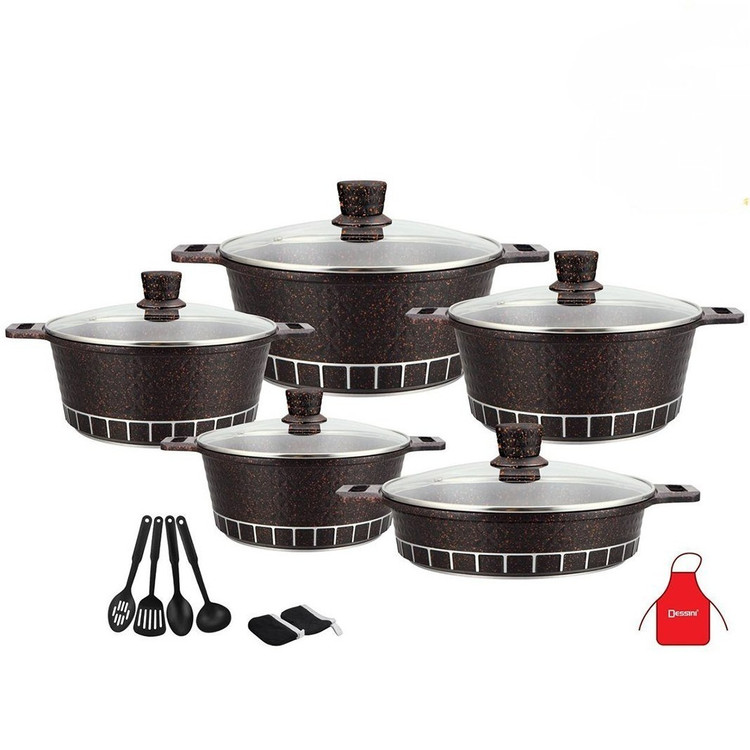 قابلمه 20 سانتیمتری (2.4 لیتر)، 24 سانتیمتری (4.4 لیتری)، 28 سانتیمتری (6.6 لیتری)، 32 سانتیمتری (9.6 لیتری) قابلمه, تابه عمیق 28 سانتیمتری (4 لیتری) و ۷عدد وسایل اشپزی