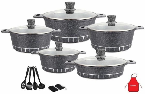 سرویس شامل: قابلمه 20 سانتیمتری (2.4 لیتر)، 24 سانتیمتری (4.4 لیتری)، 28 سانتیمتری (6.6 لیتری)، 32 سانتیمتری (9.6 لیتری) قابلمه, تابه عمیق 28 سانتیمتری (4 لیتری) و ۷عدد وسایل اشپزی